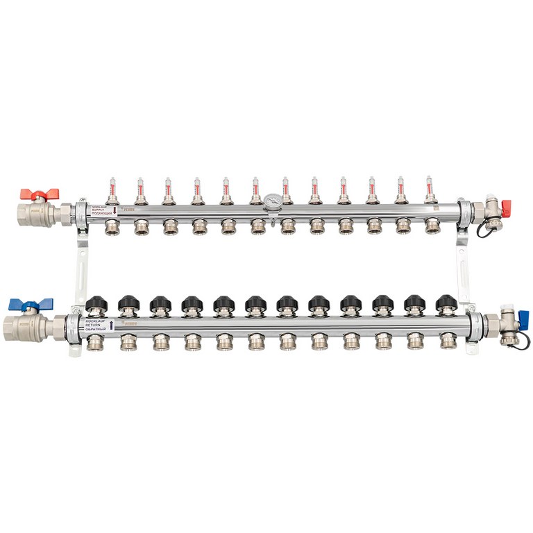 — Также коллектор включает в себя концевик с накидной гайкой 1" и уплотнительной прокладкой, воздухоотводчик 3/8" и кран для заполнения 1/2".