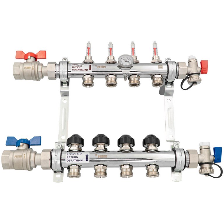 — Также коллектор включает в себя концевик с накидной гайкой 1" и уплотнительной прокладкой, воздухоотводчик 3/8" и кран для заполнения 1/2".