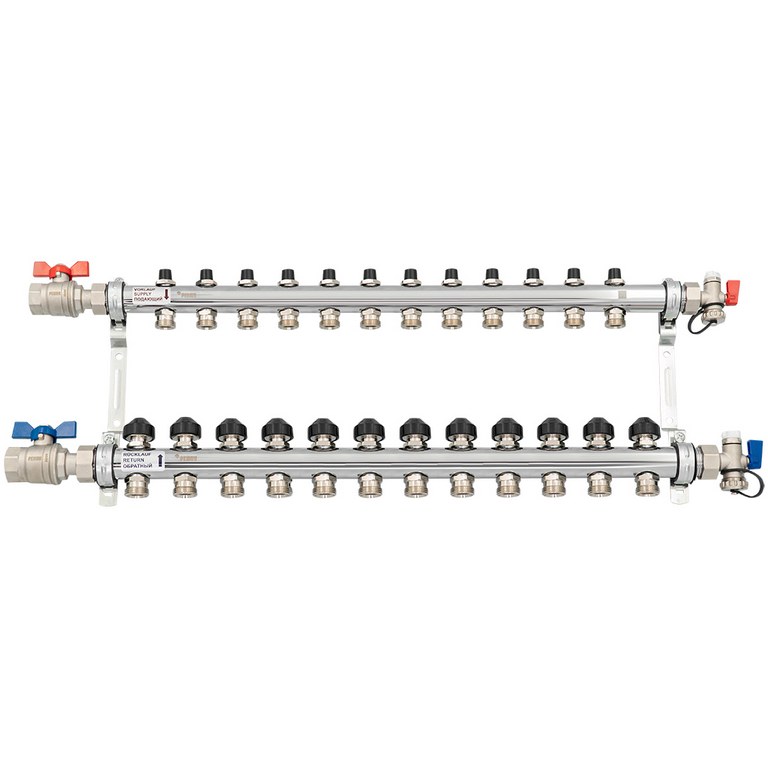 — Также коллектор включает в себя концевик с накидной гайкой 1" и уплотнительной прокладкой, воздухоотводчик 3/8" и кран для заполнения 1/2", два шаровых крана 1" с накидной гайкой 1" и уплотнительной прокладкой.