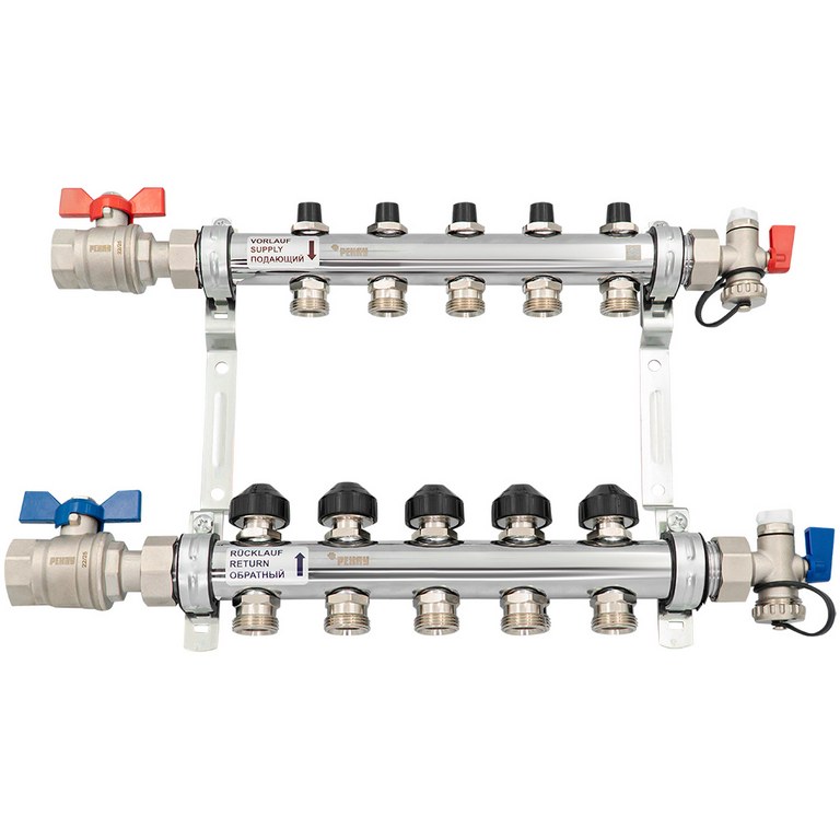 — Также коллектор включает в себя концевик с накидной гайкой 1" и уплотнительной прокладкой, воздухоотводчик 3/8" и кран для заполнения 1/2", два шаровых крана 1" с накидной гайкой 1" и уплотнительной прокладкой.