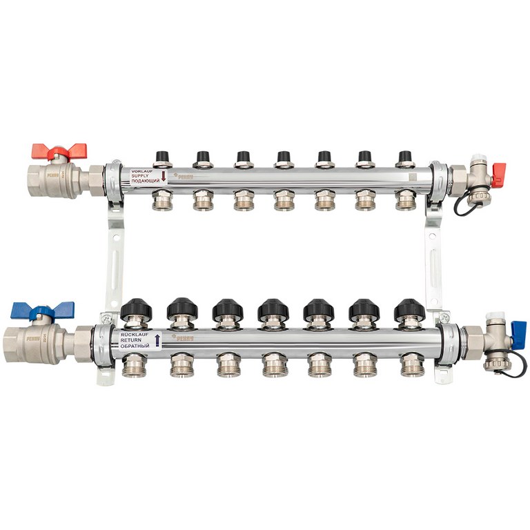 — Также коллектор включает в себя концевик с накидной гайкой 1" и уплотнительной прокладкой, воздухоотводчик 3/8" и кран для заполнения 1/2", два шаровых крана 1" с накидной гайкой 1" и уплотнительной прокладкой.