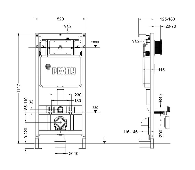 - Минимальное расстояние от стены до инсталляции РЕХАУ NOVAFLOW 135 мм