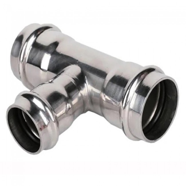 Трехраструбный пресс-тройник из нержавеющей стали обеспечивает соединение трех тонкостенных стальных труб систем водоснабжения, отопления, иных инженерных и технологических установок с рабочей температурой до 110 °С и давлением до 16 бар. Благодаря бесштуцерной конструкции соединитель обладает малым коэффициентом местного сопротивления – сужение канала практически отсутствует. Фитинг рассчитан на обжатие с помощью пресс-инструмента.